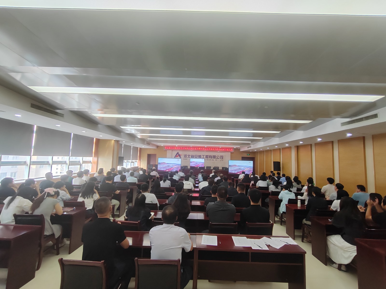 2025年9月3日,為紀(jì)念中國(guó)人民抗日戰(zhàn)爭(zhēng)暨世界反法西斯戰(zhàn)爭(zhēng)勝利80周年,河北省安裝工程有限公司積極組織職工集中觀看閱兵盛況直播。公司機(jī)關(guān)及各分公司、項(xiàng)目部共計(jì)2000余人通過(guò)多種方式同步參與,共同回顧歷史、緬懷先烈、展望未來(lái)。上午9時(shí),習(xí)近平總書(shū)記發(fā)表重要講話(huà),9時(shí)19分大閱兵正式開(kāi)始,公司機(jī)關(guān)及各分公司、項(xiàng)目部會(huì)議室座無(wú)虛席,職工們們整齊地坐在屏幕前,神情莊重地注視著電視畫(huà)面。在閱兵式過(guò)程中,
